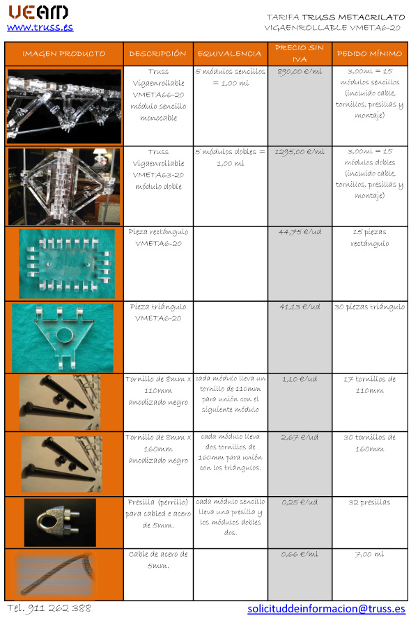 VIGAENROLLABLE VMETA6 es la única estructura truss fabricada en METACRILATO, capaz de soportar peso para la colocación de luz y sonido.